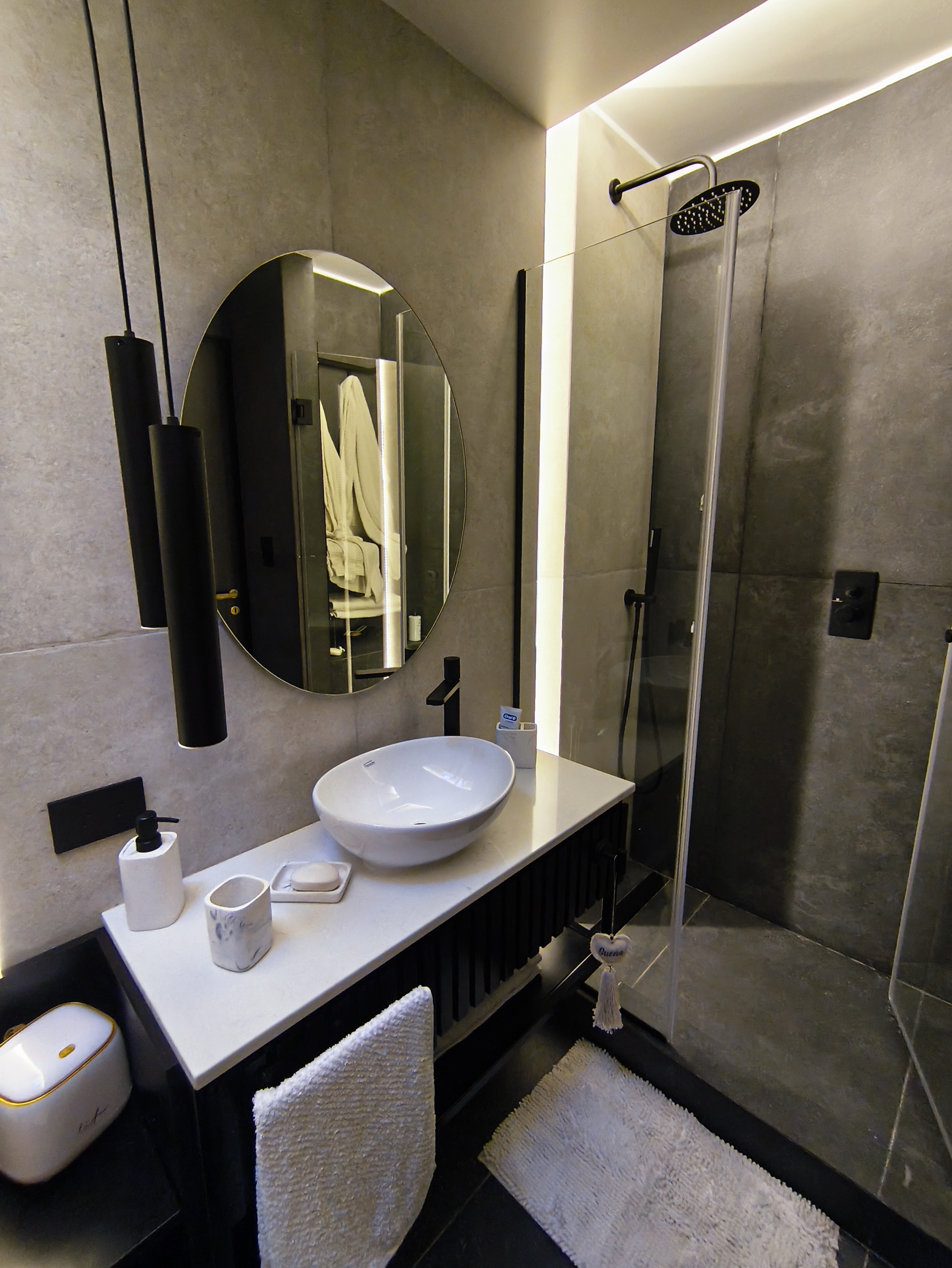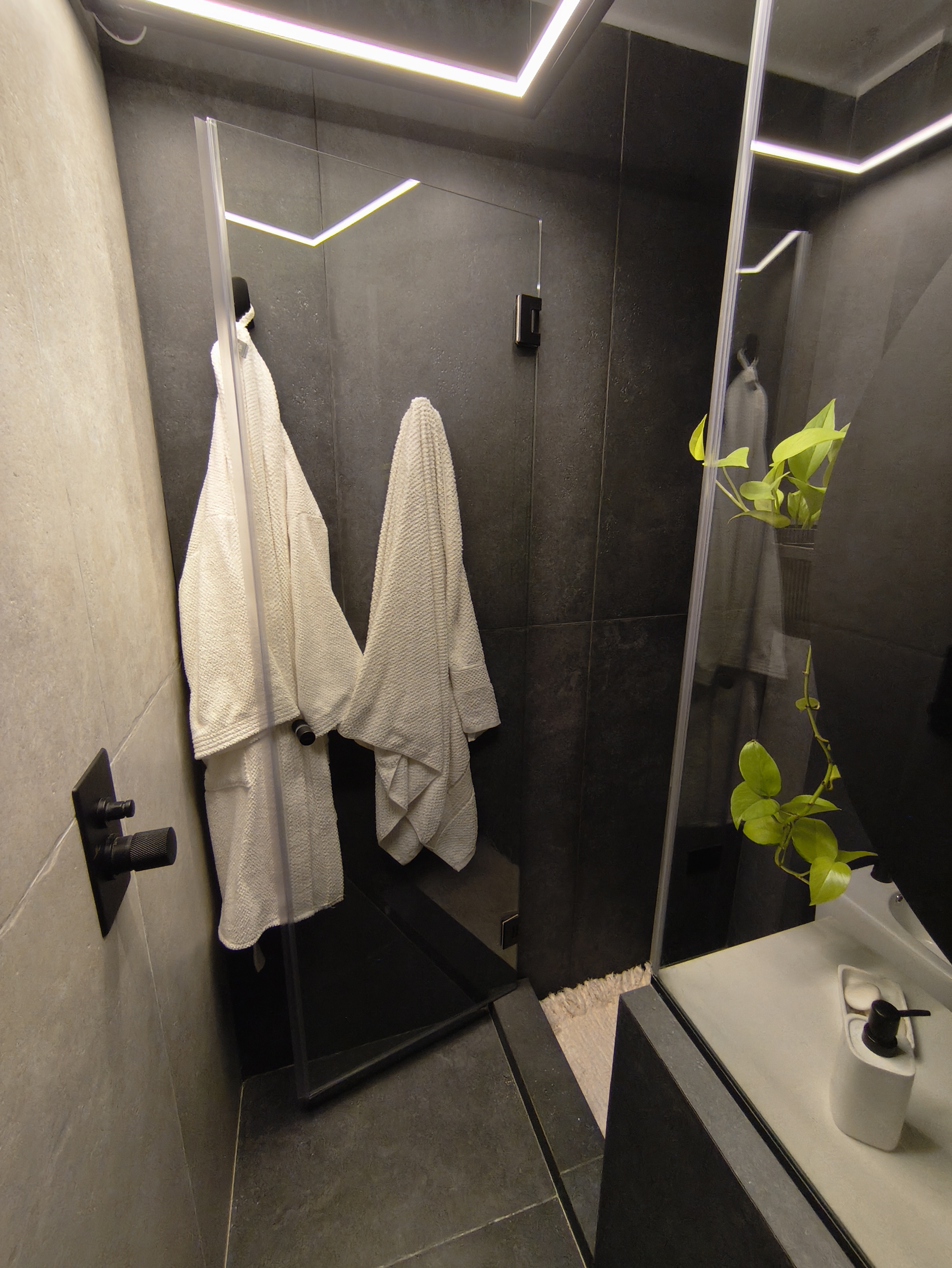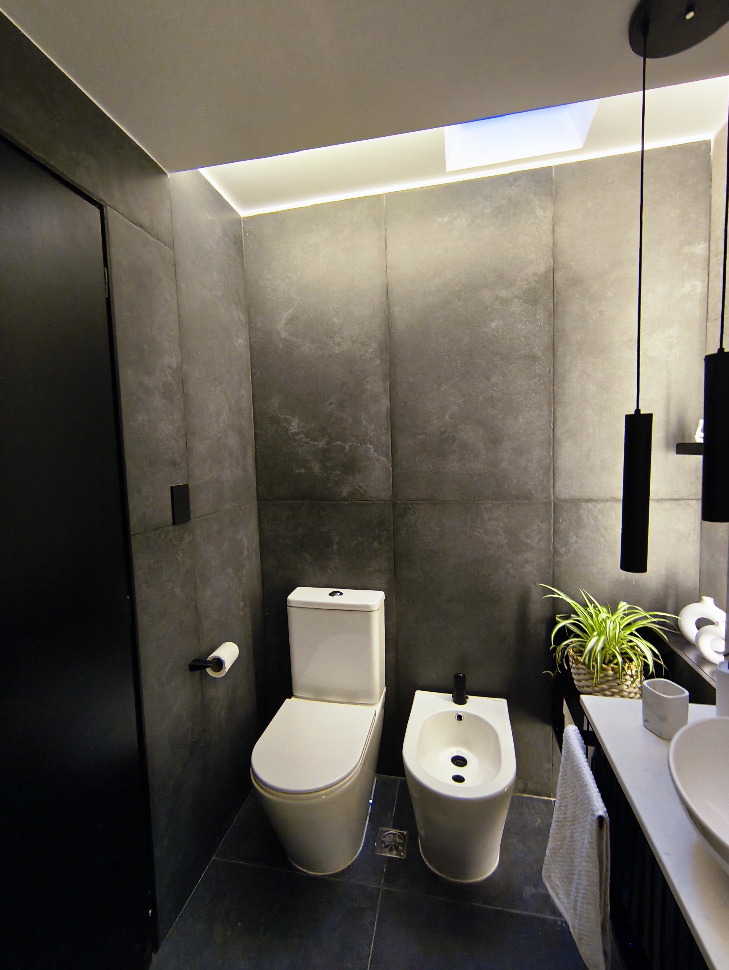 Dos baños que venían con la casa, en buen estado, sin problemas de cañerías ni urgencias… pero que pedían a gritos una nueva vida. Uno en suite y otro para las habitaciones secundarias. El desafío no era arreglar, sino transformar. El baño en suite era largo y angosto, y tenía un placard que daba a la habitación. A simple vista parecía pequeño, pero al momento de vaciarlo nos sorprendió todo lo que guardaba. Aun así, entendimos que ese espacio tenía mucho más potencial si se animaba a cambiar. Decidimos demoler el placard y redistribuir completamente el baño. Hoy, al entrar, lo primero que aparece es la bacha; detrás, la ducha se ubica justo bajo la claraboya, regalando no solo un gran momento de agua caliente, sino también un baño de luz natural que transforma la experiencia. Inodoro y bidet se reubicaron donde antes estaba el placard, logrando un baño mucho más amplio, cómodo y luminoso. Realmente, un antes y después. El Baño II tenía otra problemática. De planta más bien cuadrada, obligaba a rodear la puerta para llegar a la bacha. Aunque ya estaban acostumbrados, existía el deseo de entrar y encontrarse directamente con el vanitory. Además, una mocheta y una viga dividían el espacio y dificultaban cualquier intento de reorganización. En lugar de luchar contra eso, decidimos hacerlo protagonista. Ensanchamos la mocheta al ancho del vanitory y la convertimos en un elemento de énfasis: sumamos iluminación lateral, bajamos el cielorraso y lo acompañamos con una vuelta de tira LED que jerarquiza ese sector por sobre el resto del baño. El resultado fue increíble: un espacio con carácter, intención y una identidad muy marcada. Dos baños, dos decisiones distintas, un mismo objetivo: potenciar lo que ya estaba y llevarlo un paso más allá.