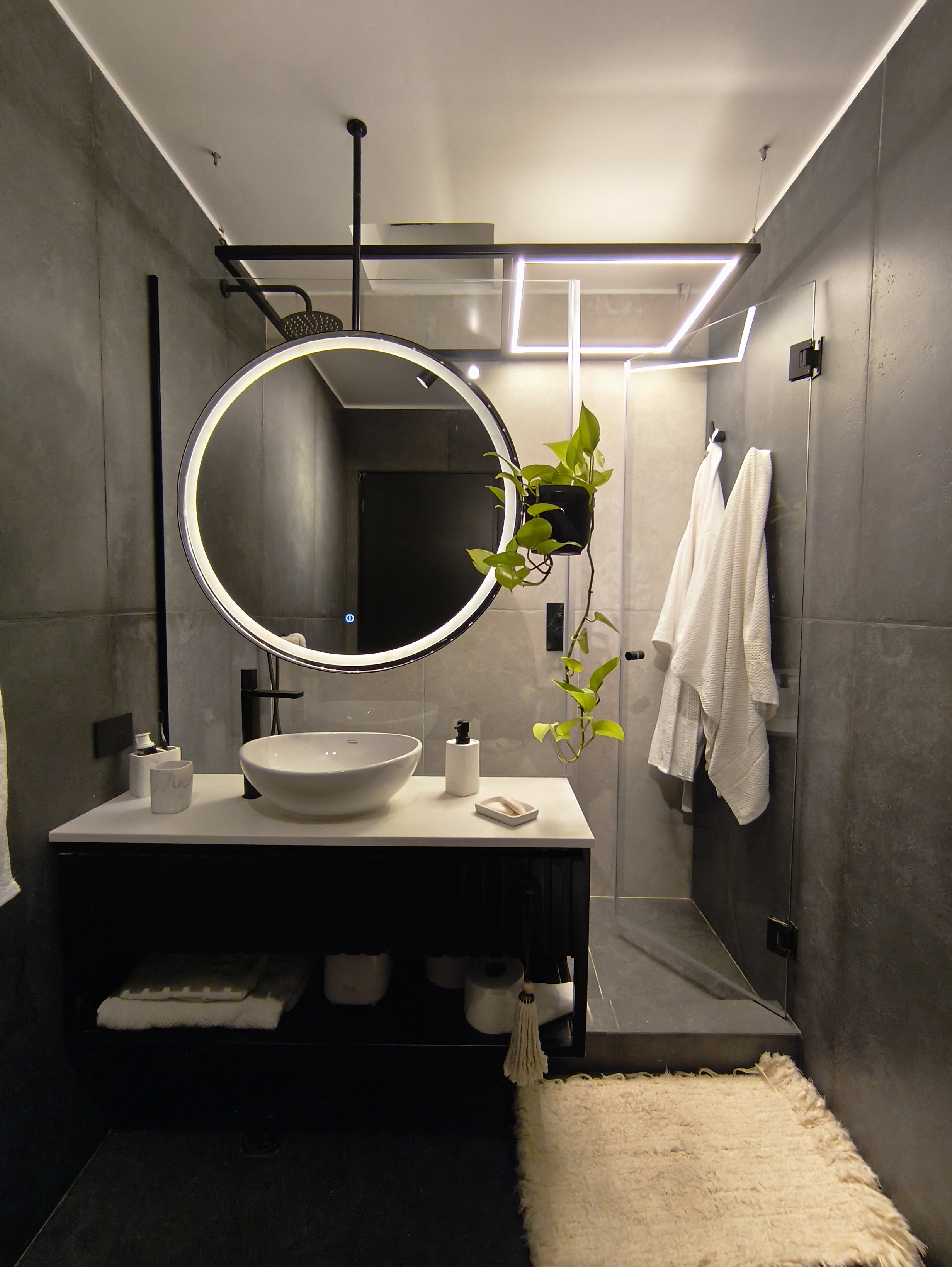 Dos baños que venían con la casa, en buen estado, sin problemas de cañerías ni urgencias… pero que pedían a gritos una nueva vida. Uno en suite y otro para las habitaciones secundarias. El desafío no era arreglar, sino transformar. El baño en suite era largo y angosto, y tenía un placard que daba a la habitación. A simple vista parecía pequeño, pero al momento de vaciarlo nos sorprendió todo lo que guardaba. Aun así, entendimos que ese espacio tenía mucho más potencial si se animaba a cambiar. Decidimos demoler el placard y redistribuir completamente el baño. Hoy, al entrar, lo primero que aparece es la bacha; detrás, la ducha se ubica justo bajo la claraboya, regalando no solo un gran momento de agua caliente, sino también un baño de luz natural que transforma la experiencia. Inodoro y bidet se reubicaron donde antes estaba el placard, logrando un baño mucho más amplio, cómodo y luminoso. Realmente, un antes y después. El Baño II tenía otra problemática. De planta más bien cuadrada, obligaba a rodear la puerta para llegar a la bacha. Aunque ya estaban acostumbrados, existía el deseo de entrar y encontrarse directamente con el vanitory. Además, una mocheta y una viga dividían el espacio y dificultaban cualquier intento de reorganización. En lugar de luchar contra eso, decidimos hacerlo protagonista. Ensanchamos la mocheta al ancho del vanitory y la convertimos en un elemento de énfasis: sumamos iluminación lateral, bajamos el cielorraso y lo acompañamos con una vuelta de tira LED que jerarquiza ese sector por sobre el resto del baño. El resultado fue increíble: un espacio con carácter, intención y una identidad muy marcada. Dos baños, dos decisiones distintas, un mismo objetivo: potenciar lo que ya estaba y llevarlo un paso más allá.